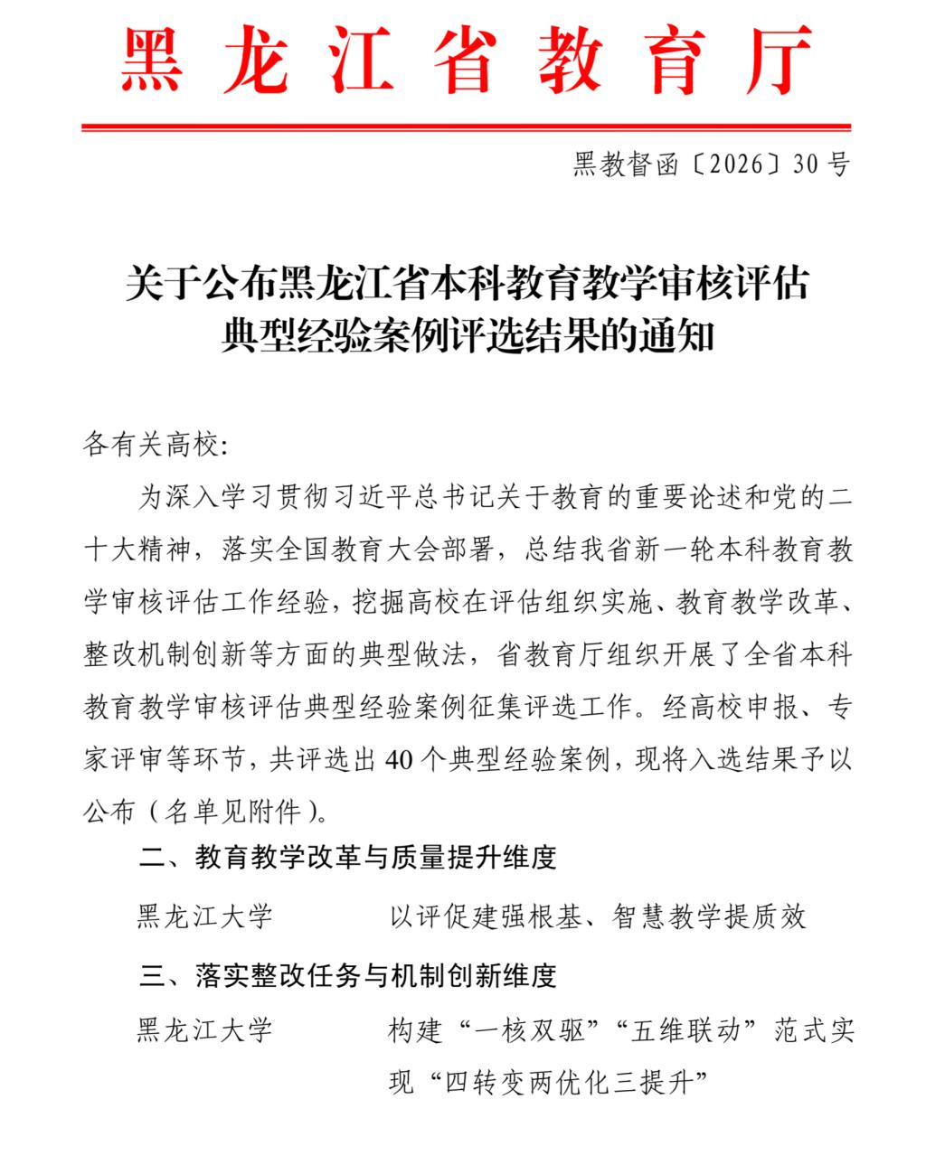 2025年12月,省教育厅面向全省39所本科高校组织开展了全省本科教育教学审核评估典型经验案例征集评选工作。2026年3月,省教育厅发布了《关于公布黑龙江省本科教育教学审核评估典型经验案例评选结果的通知》,共评选出40个典型经验案例。我校组织申报的《构建“一核双驱”“五维联动”范式实现“四转变两优化三提升”》《以评促建强根基、智慧教学提质效》2个案例成功入选。